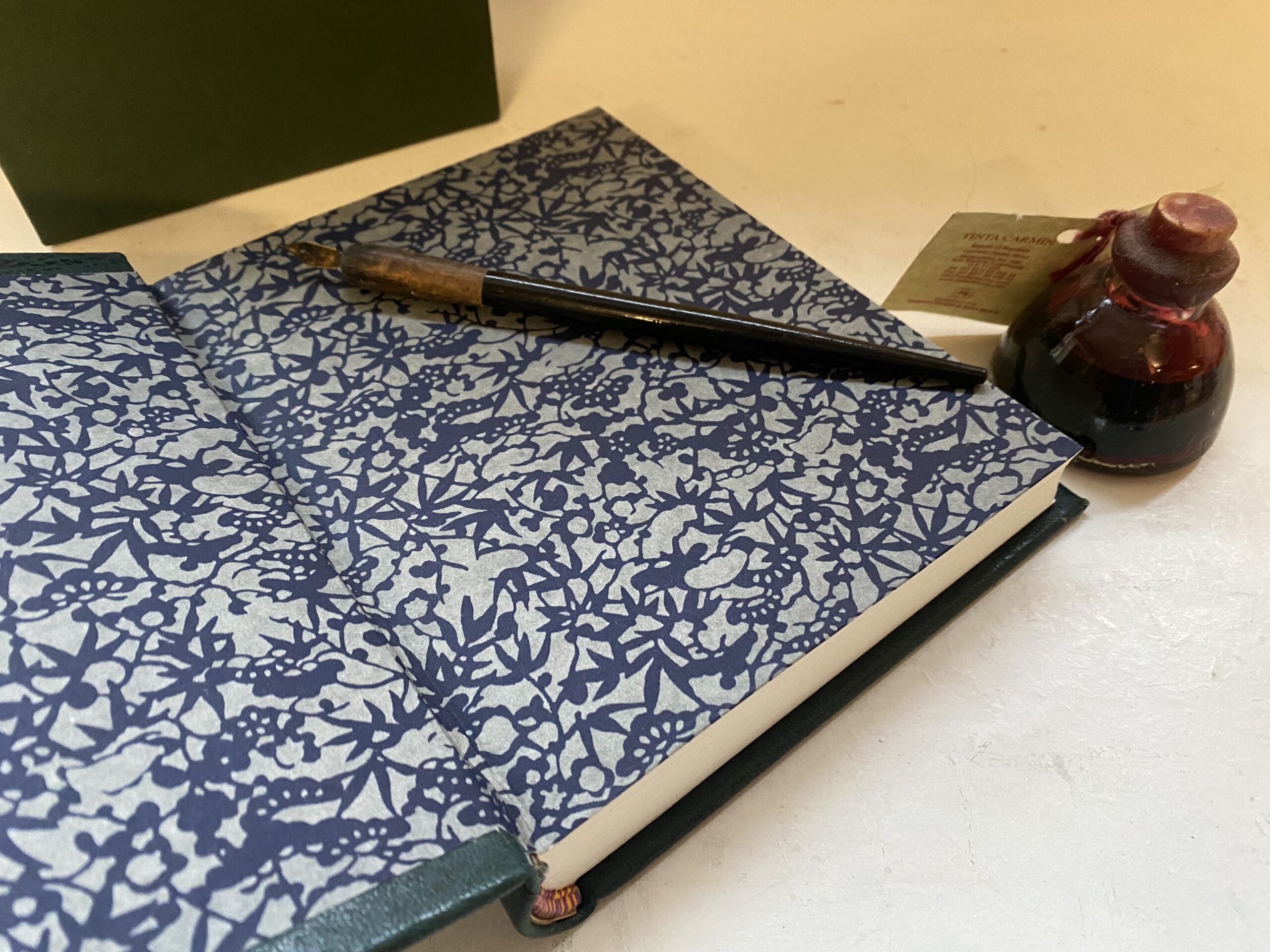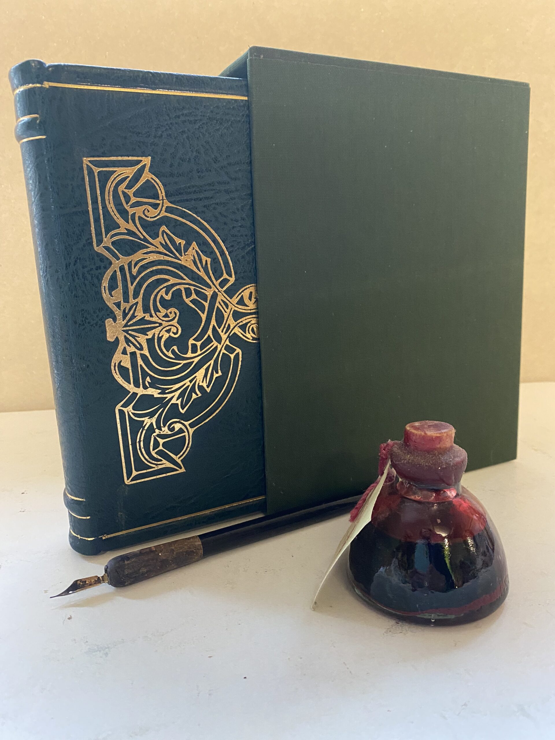 - Dark green cloth covered slipcase for protection
